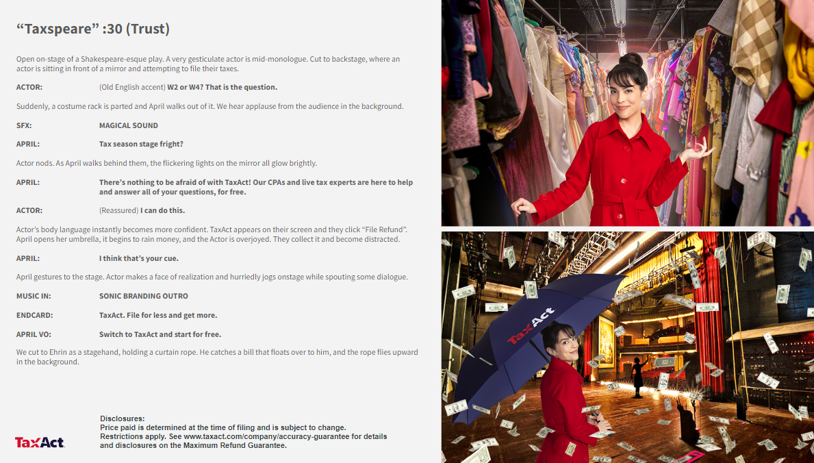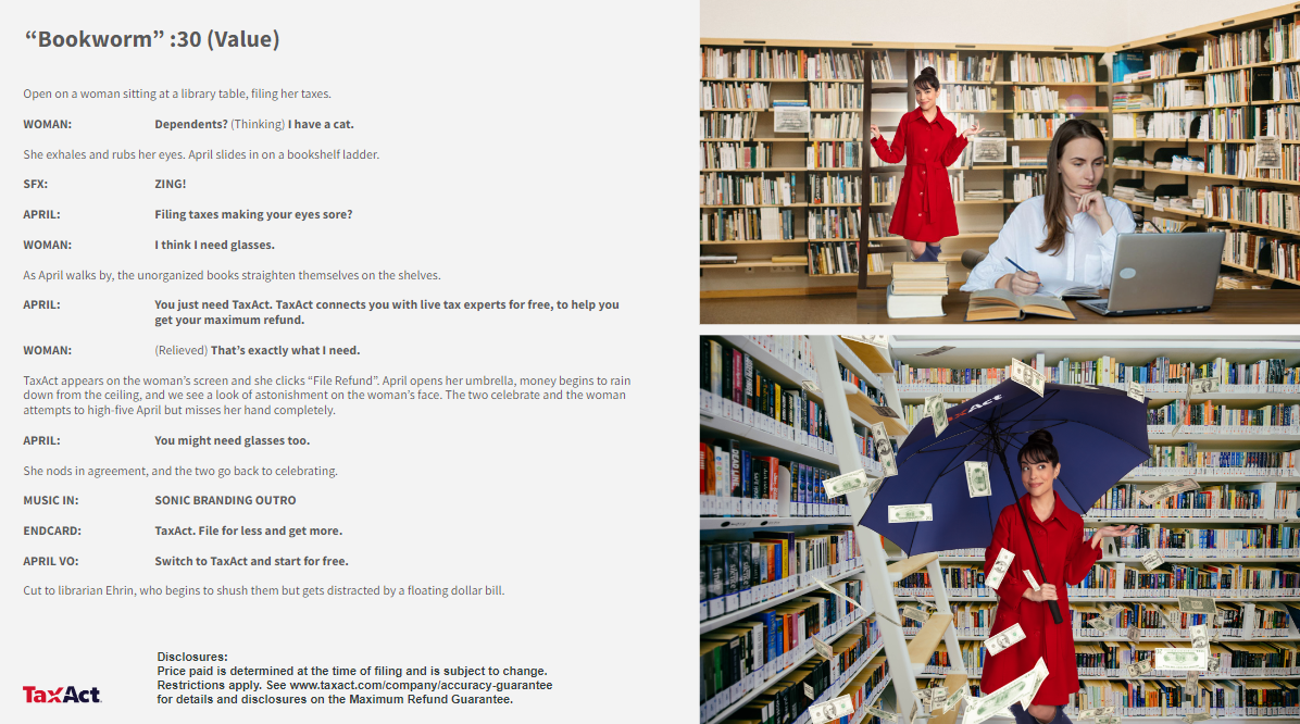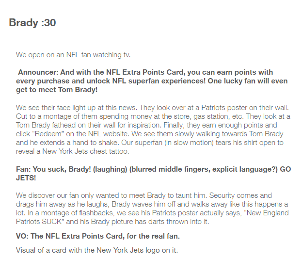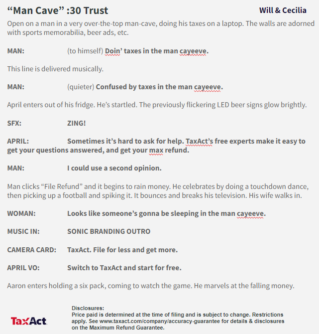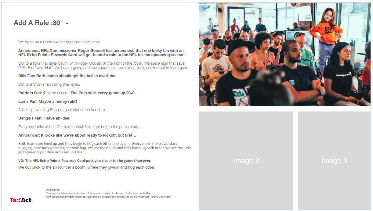 The first two television scripts are from a campaign for a Bread Financial x NFL credit card. This commercial showcases the possible benefits and rewards that NFL superfans experience when using this credit card. The final three scripts are from a campaign for TaxAct. The spots followed a fairly consistent general outline, but we had creative liberty for the dialogue and location of the commercials. The social media snippets are from a campaign for Bread Financial. Our purpose with these ads was mainly retargeting consumers who were already familiar with our product.